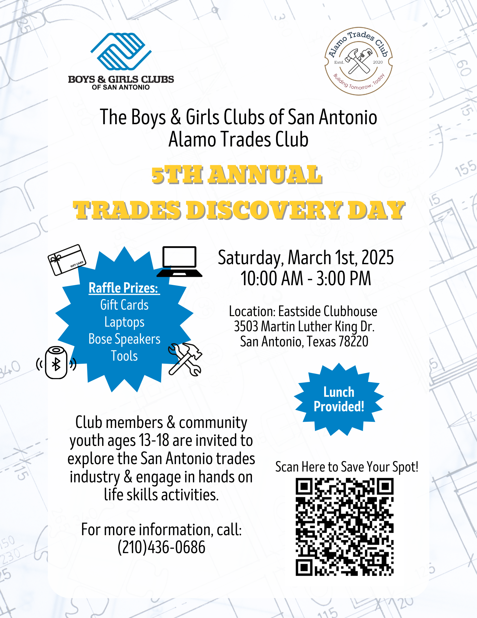 Calling all teens ages 13-18 to attend Alamo Trades Day hosted by Boys & Girls Clubs of San Antonio! Join us for an exciting opportunity to explore the San Antonio trades industry and engage in hands-on life skills activities. This is a fantastic chance to learn about various trades and develop essential skills.
